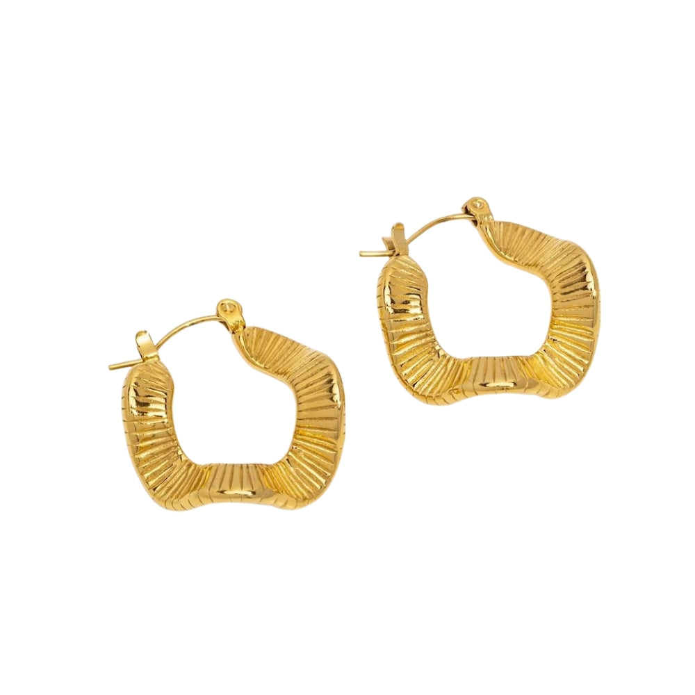 Pair them with sleek hair or a minimalist ensemble to highlight their fluid texture — the Golden Ripple Hoops radiate confidence and elegance with every wear.